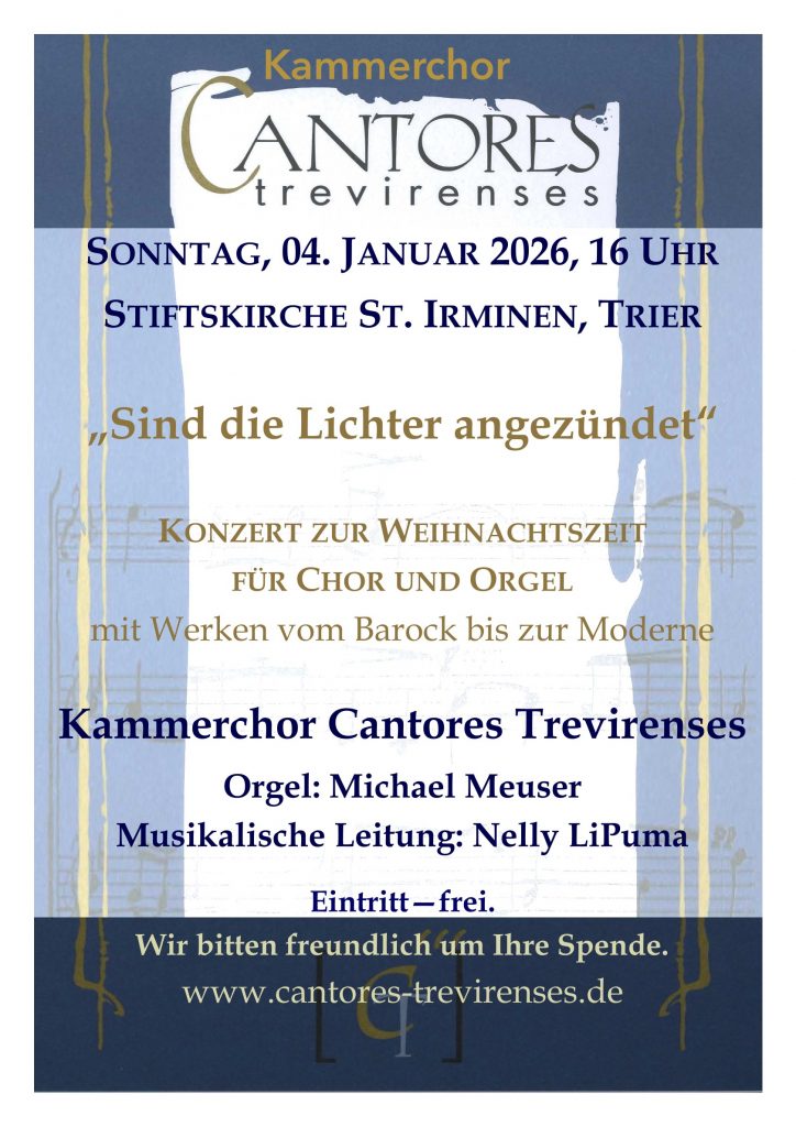 Das traditionelle Weihnachtskonzert des Kammerchores Cantores Trevirenses findet am 04.01.2026 um 16.00 Uhr in der Stiftskirche St. Irminen in Trier statt. Unter der Leitung von Nelly LiPuma erklingt ein Liederreigen mit Werken aus ganz Europa von der Renaissance bis zur Moderne sowie Orgelmusik gespielt von Michael Meuser. Der Eintritt zum Konzert ist frei. Der Chor bittet um eine Spende zur Unterstützung der Chorarbeit.